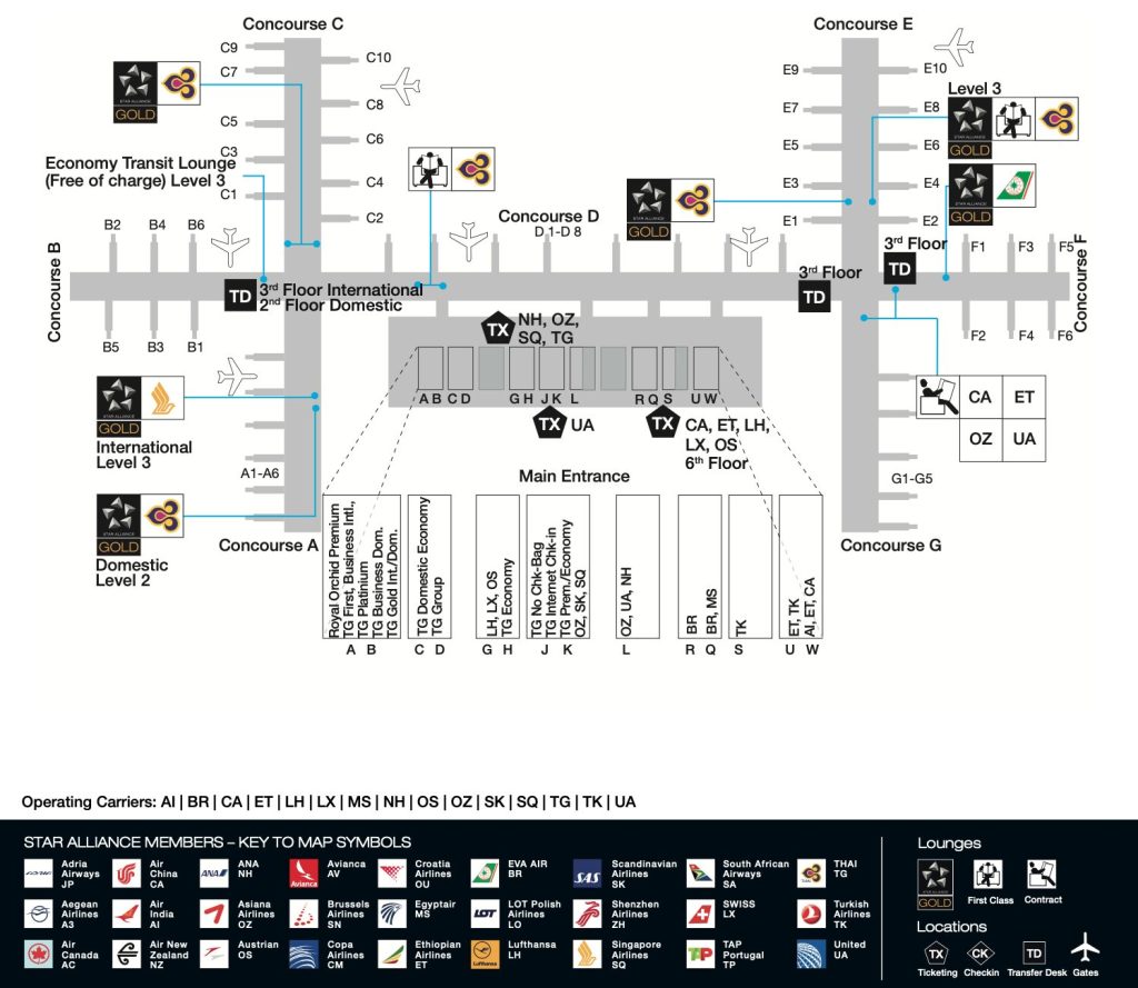 スワンナプーム空港のSTAR ALLIANCE加盟航空会社のラウンジマップ