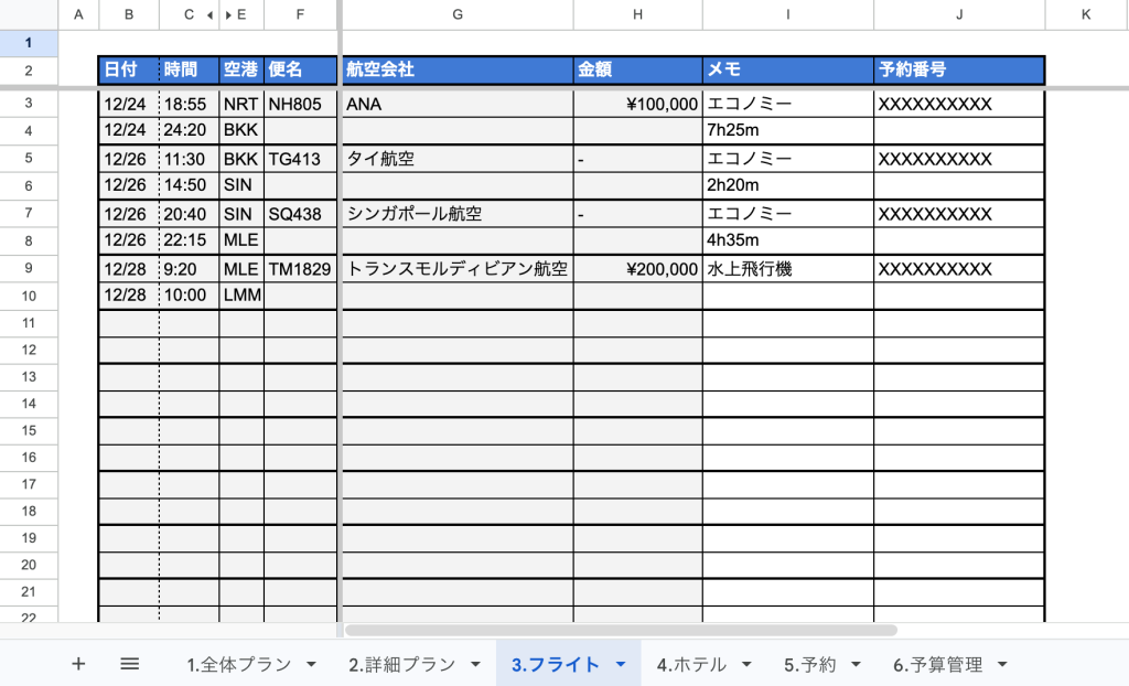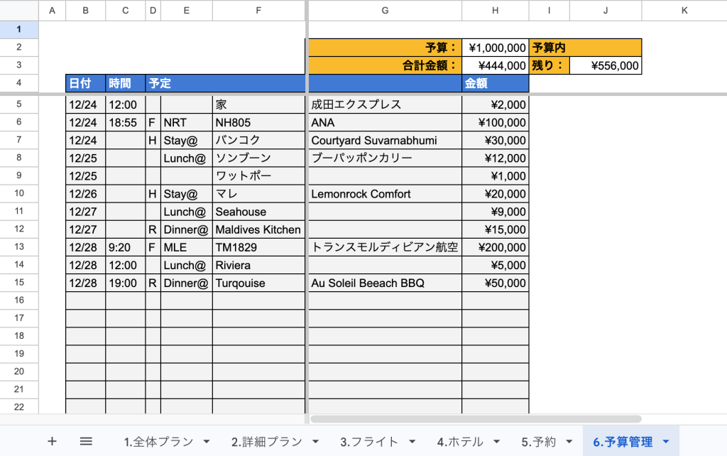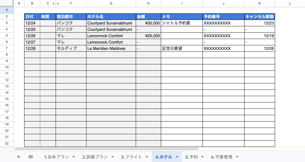 このシートが旅程のメインシートになります。