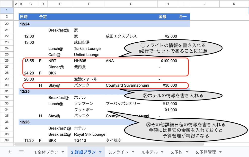 ③その他詳細旅程を書き入れる