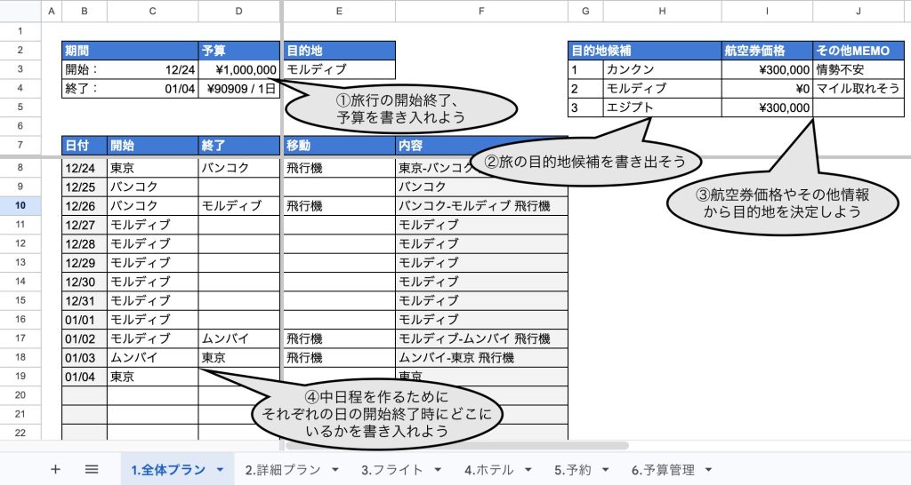 この旅行計画テンプレートは、