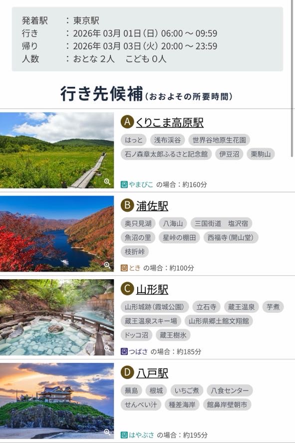 人気観光地や地方都市へのサプライズ旅が楽しめます。